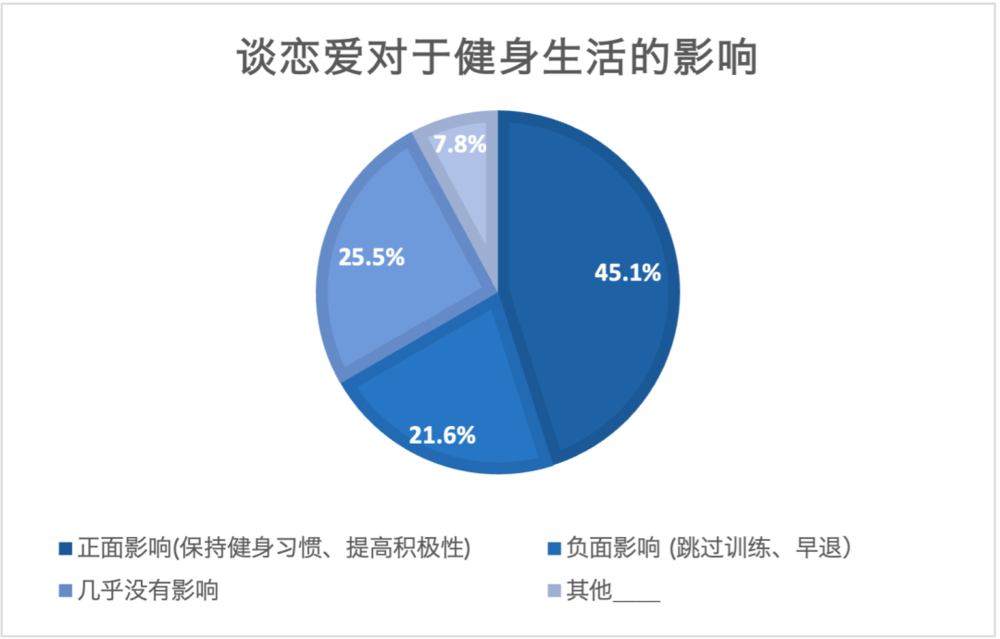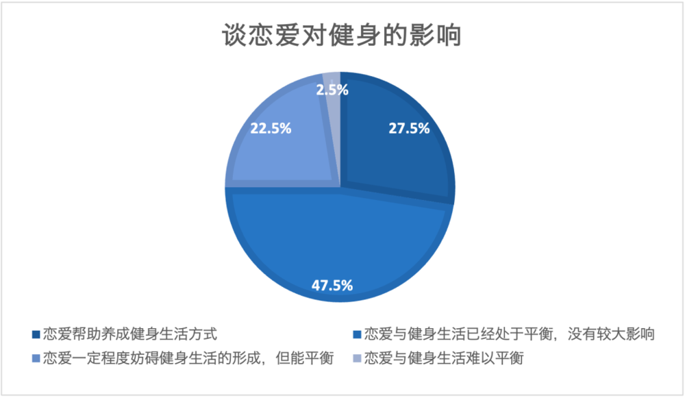 虽然恋爱生活会影响原先的健身计划,但90%男性单人健身者表示,恋爱并没有对健身生活有负面影响,甚至近半数有更高的积极性去锻炼,而锻炼发生的事也能成为恋爱的话题。