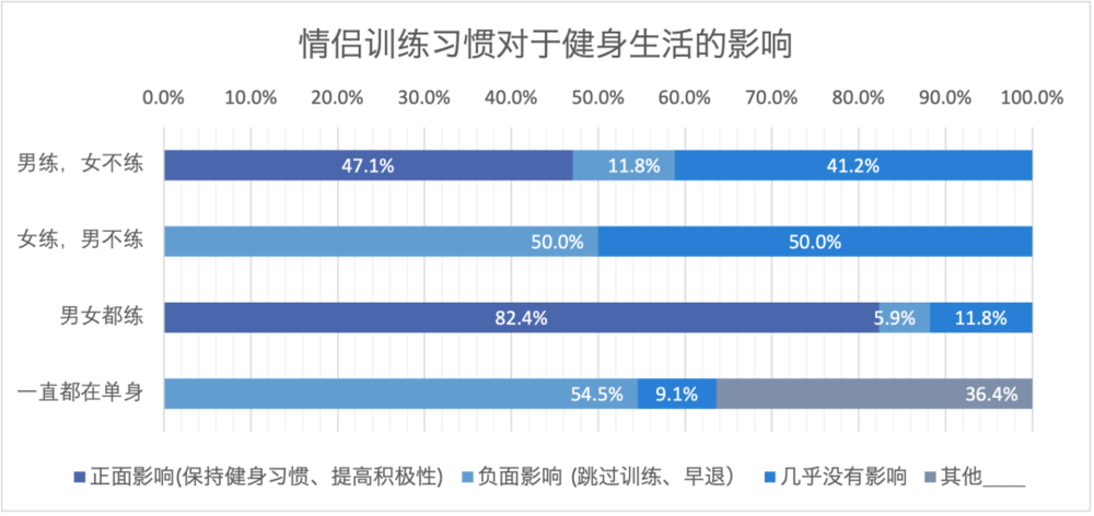 反之,恋爱也会给人带来更多的惰性和逃避痛苦训练的借口,比如在“女练,男不练”的情况下,有50%的人认为健身生活方式受到了恋爱的负面影响。