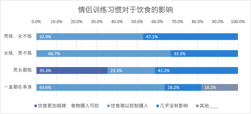 单人健身者在饮食控制上可谓是困难重重,受访的23对“单人健身”情侣代表尚未出现饮食更加规律的情况。“男练,女不练”中,超半数男性健身者难以维持自己的饮食摄入,通常会产生过量饮食。