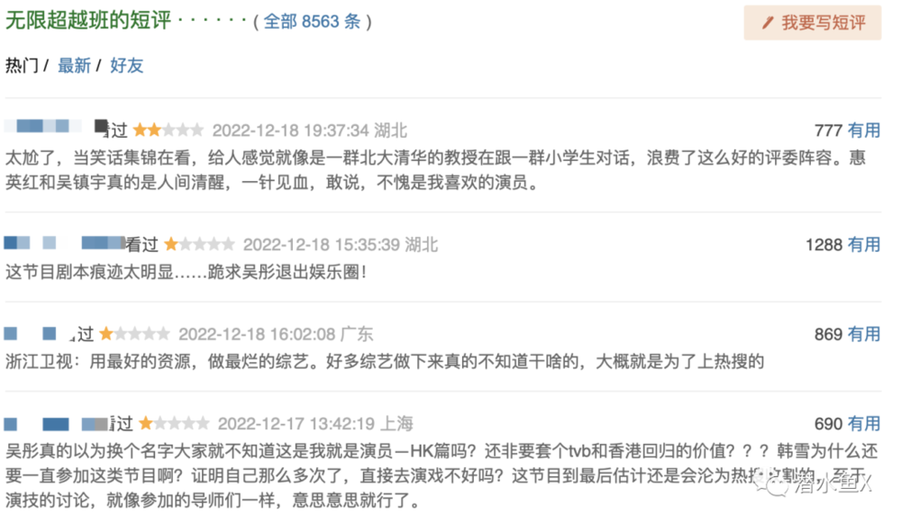 差生代表《无限超越班》的豆瓣热评里这样写:浙江卫视,用最好的资源,做最烂的综艺。好多综艺做来不知为了干啥,可能就是为了上热搜。建议吴彤退出娱乐圈。