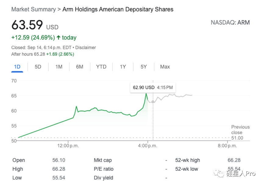 今日开盘之后,Arm股价果然迅速拉涨,涨幅一度突破28%。以63.59美元的收盘价计算,Arm市值为652.48亿美元,摊薄后的估值接近680亿美元。