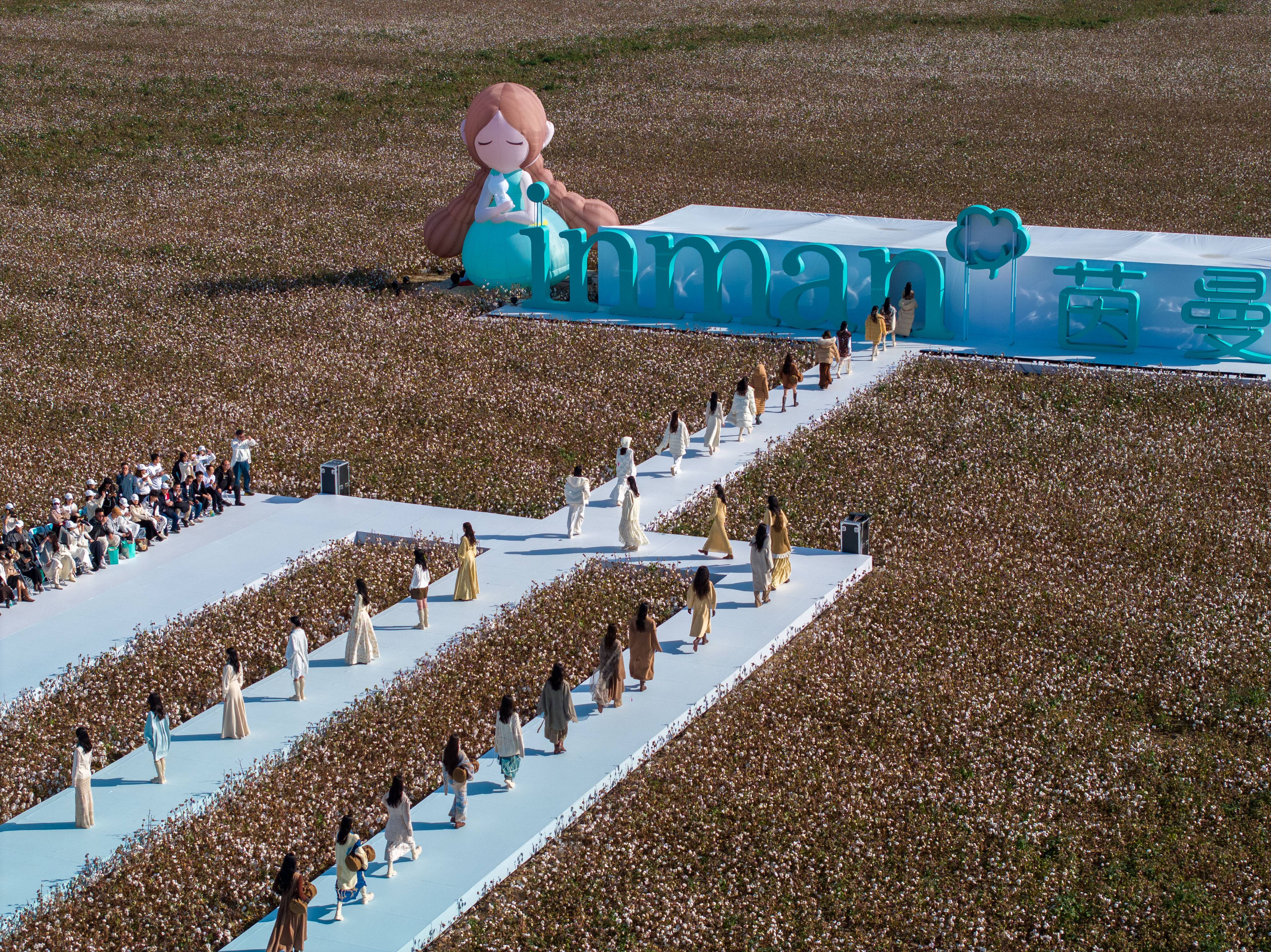9月23日,新疆。在远处起伏的雪山的注视下,茵曼将一场本该在时尚T台上的时装秀搬到了一片棉田里。T台上,数十个模特展示了茵曼突破传统单维度棉麻设计风格的秋冬新款,覆盖田园度假、文艺轻户外、艺术通勤、田园户外四个场景。
