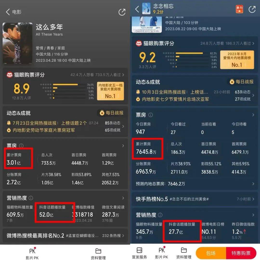 到今年,张新成、孙千主演的《这么多年》以52亿话题播放量,仅换来3亿票房;刘浩存、宋威龙主演的《念念相忘》以27亿话题播放量,仅换来七千万票房;《前任4》现在80亿的话题播放量,换不来票房破10亿。短视频营销带给爱情片的票房转换率,越来越低。