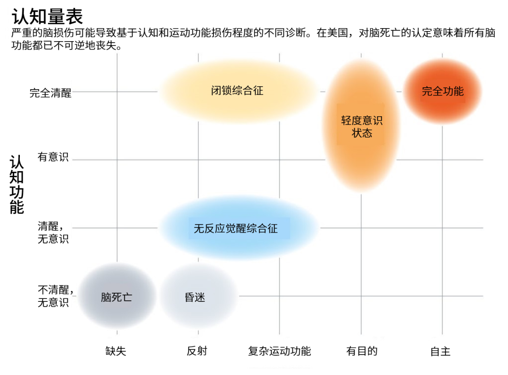 严重的脑损伤可能导致基于认知和运动功能损伤程度的不同诊断。在美国,对脑死亡的认定意味着所有脑功能都已不可逆地丧失。