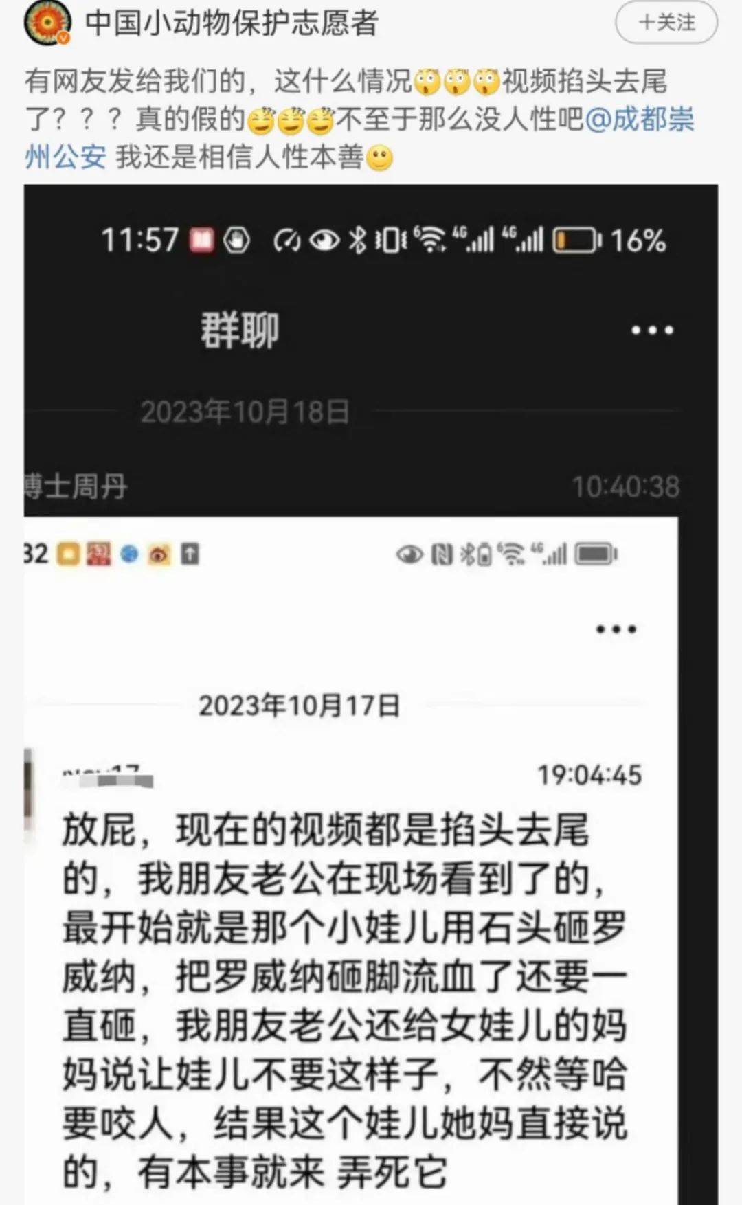 10月18日,一位用户名为中国小动物保护志愿者的人在微博上发布了一条所谓“网友发给自己”的毫无证据支持的言论,说小女孩被咬的视频被掐头去尾,完整的视频里是小女孩拿石头砸了罗威纳犬,把罗威纳脚砸流血了还一直砸,所以才会被咬。
