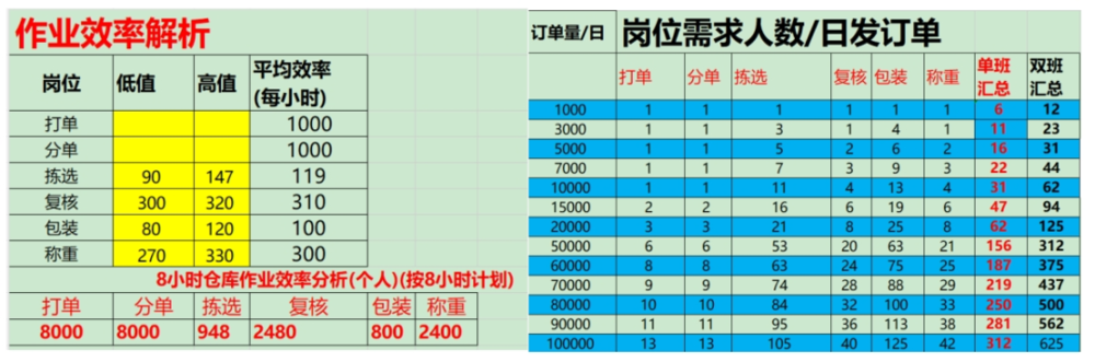 2. 排产产能:人员的投入一定是严格按照场景化的环节产能来匹配用工,上述有提到,仓内生产根据商家的销售策略定为三大生产场景:预包、提总、散单。在这些场景下会有完全不同的环节生产流程,这些独立的环节应该当独立的人效评估,而这些环节人效则是支撑排产上人核心基础条件。
