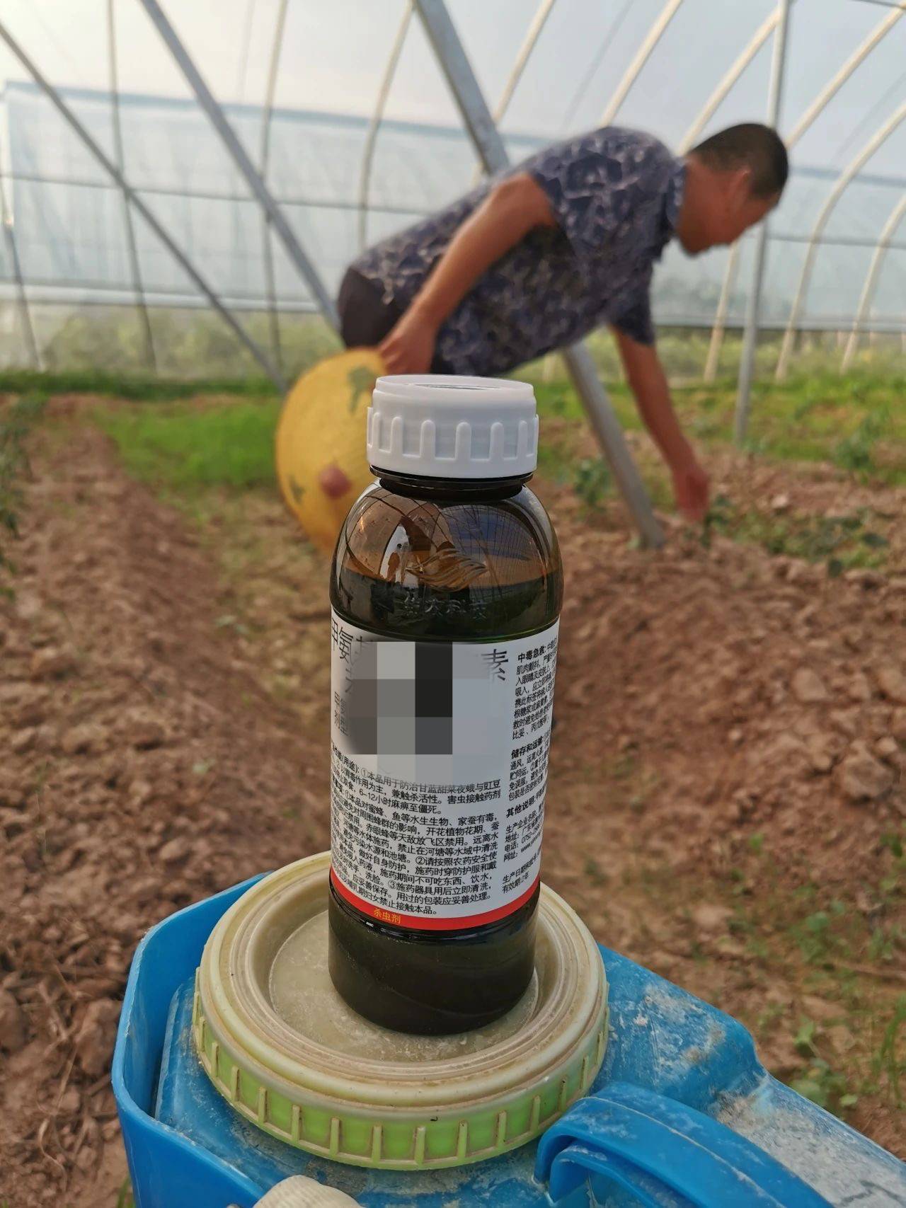 棚内准备打药的农民和搅拌好的农药。作者供图