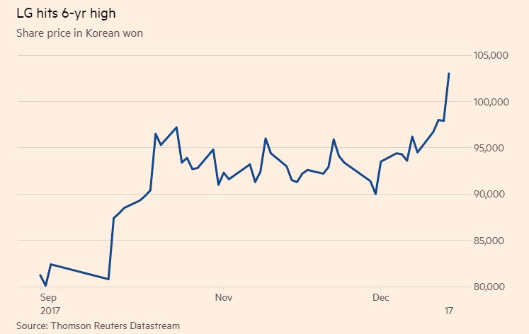 据《金融时报》北京时间12月14日报道,随着市场越来越看好LG电子的第四季度业绩,LG股价在今天涨至六年来的最高水平。
