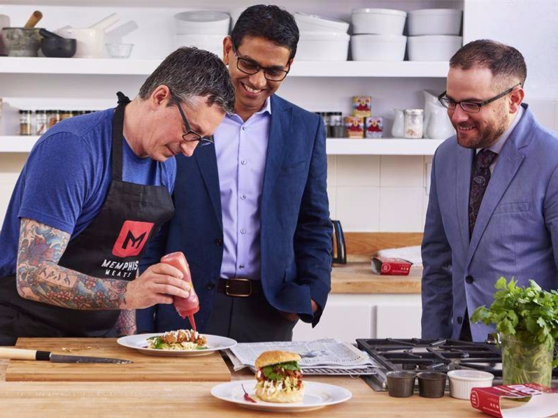 比如Beyond Meat公司就是靠这种工艺来制作人造牛肉和人造鸡肉的。下图就是Beyond Meat创始人和他身旁的“造肉”机器。