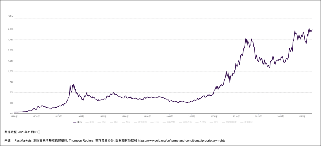 1971年至今,以美元计价的黄金价格走势图