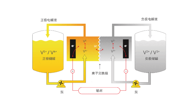 液流电池将反应物储存于电解质溶液中,正负极的电解液在单元外存储,利用泵和管路输送到电池内部,电解液循环供给。