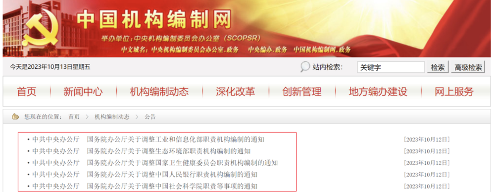 中央机构方面:最新据中国机构编制网10月12日披露,中共中央办公厅、国务院办公厅发布调整相关国务院组成部门、直属事业单位职责机构编制的通知,涉及工业和信息化部、生态环境部、国家卫生健康委员会、中国人民银行、中国社会科学院等。
