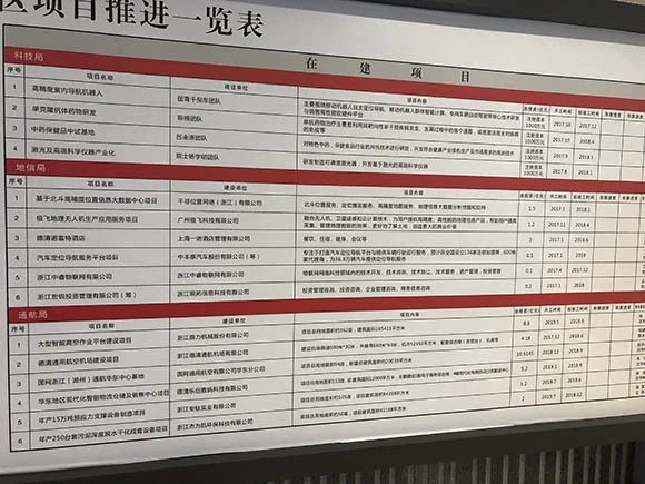 在德清高新区管委会楼下,有一整面墙都是德清高新区官网项目的进展图——其中包括北斗高精度地理位置大数据中心项目、机飞无人机项目等共计百余项。具体涵盖项目名称、建设单位、项目内容、投资额、开工竣工时间等。
