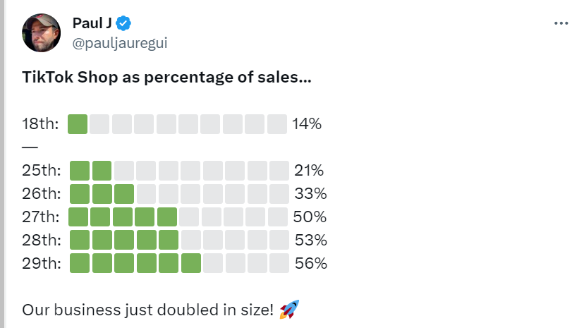 从第 3 个月,也就是 10 月份开始,BK Beauty 前两个月的投入开始体现在销售上,Paul 在 X.com 上分享了 TikTok Shop 在不到半个月内为品牌贡献的收入,到 10 月 29 日,TikTok Shop 带来的销售已经占到 BK Beauty 全渠道单日销售额的一半以上。
