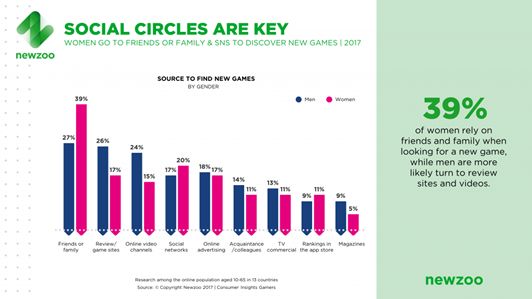 NewZoo发布的《男性与女性玩家的异同如何塑造游戏市场》报告也证实了这样的观点。39%的女性是通过朋友和家人发现新游戏的,相较于男性的27%高了12个百分点,20%的女性也会通过社交来发现新游戏,也就是我们说的朋友圈和微博。而这个数据是针对全球的,中国玩家范围内的差异可能更明显。男性玩家更主动去观测KOL和垂直类网站发布的游戏内容,来判断一款新游戏是不是值得玩。