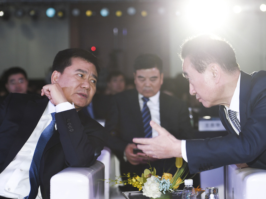 本文头图:2017年12月19日,苏宁董事长张近东(左)与万达董事长王健林在南京的一场会上交流。©视觉中国