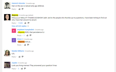 当然创作者们也会在评论中挑选观众提问进行节目制作,其中一个名为litojonny的观众提出了一个有点令人难堪的问题——“为什么肛门会长毛?”没想到居然得到了创作者们的回应。就这样,一期名为“Why Do We Have Butt Hair?”的节目就这样诞生了。