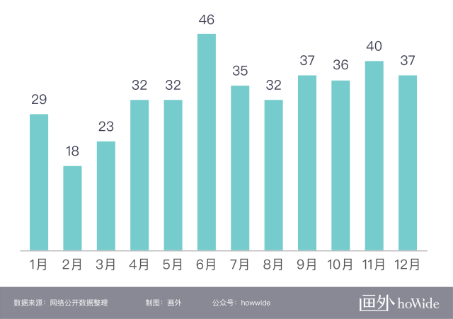 2017年平均每月上映影片33部,第一季度上映的新片数量比较少,其后每月上映的新片数量比较平均。其中,2月份上映的新片数最少,仅18部,主要原因可能是因为春节假期不便于新片宣发。6月份上映的新片数最多,共46部。