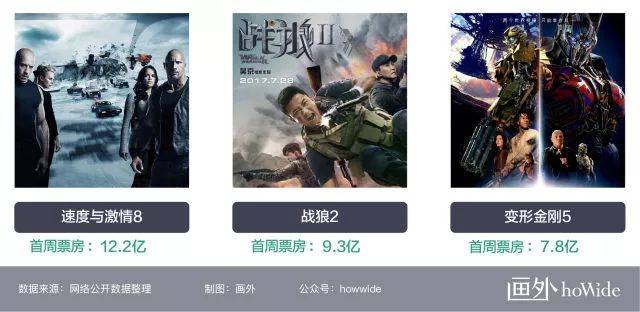 首周票房最高的影片是《速度与激情8》,高达12.2亿,其次是《战狼2》和《变形金刚5》,分别为9.3亿和7.8亿。票房高的影片,首周票房通常都比较高,两者之间有很高的相关性,这很容易理解。也存在一些总票房高但首周票房不高的影片,这类影片通常是靠口碑上位的。
