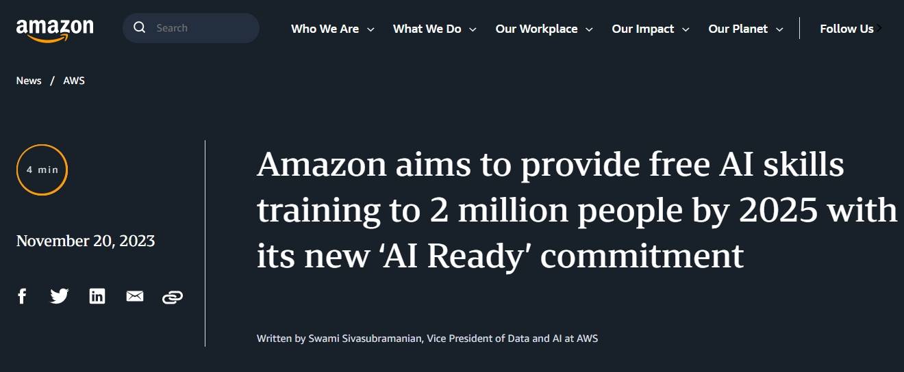 亚马逊高管Sivasubramanian声称,该公司的主要目标是使生成式人工智能教育“民主化”。他补充说,工人的技能培训不仅有利于亚马逊,也有利于其企业客户,他们需要更多受过人工智能教育的员工。