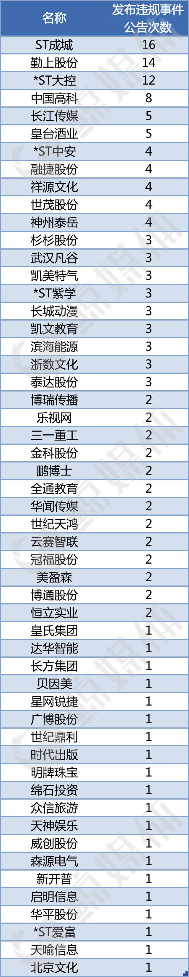 值得注意的是,ST成城、勤上股份、*ST大控近年来的违规次数都超过10次。