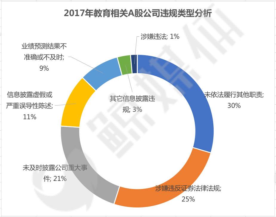 如果把上述2017年教育相关公司的违规事件类型进行拆分,鲸媒体发现,违规事件类型占比最多的是“未依法履行其他职责”,占30%。随后占比较多的是“涉嫌违反证券法律法规”及“未及时披露公司重大事件”,这两者合计占比达46%。