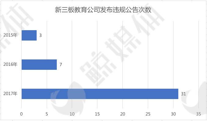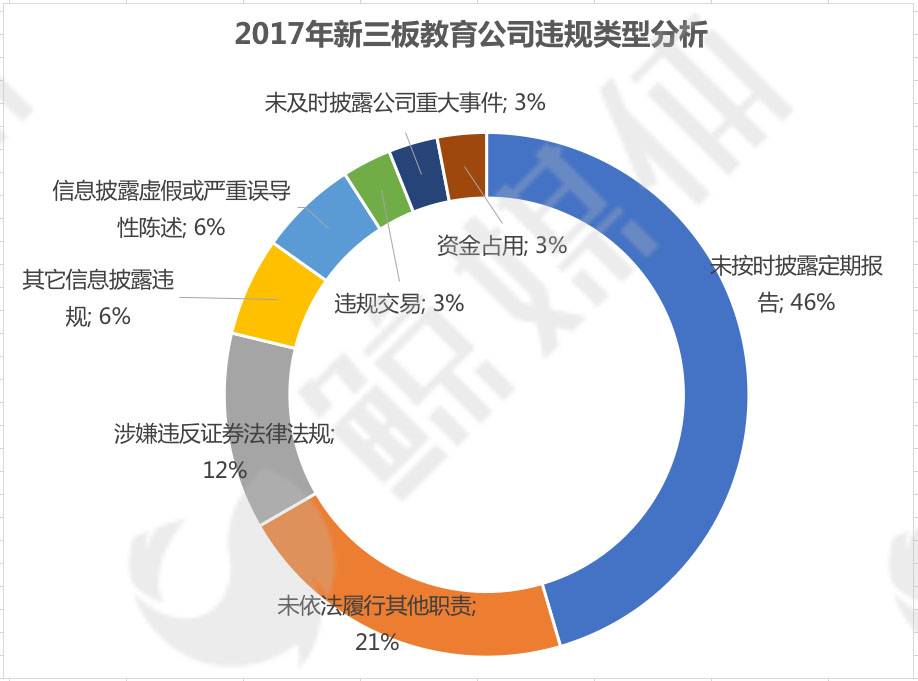 从上面新三板教育公司违规类型的分析图中我们发现,“未按时披露定期报告”的违规事项在2017年全年的违规类型中占比接近一半。“未依法履行其他职责”“涉嫌违法证券法律法规”二者的占比总和也超过三成。
