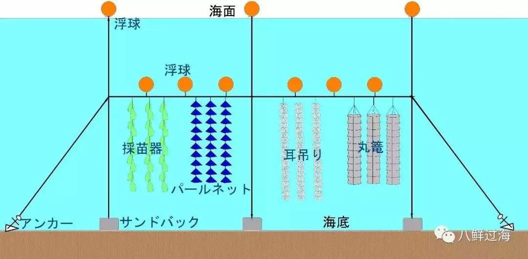如上图可见,垂下式的优点是不用担心扇贝跑掉或躲起来,并且可以优化空间分配利用。但缺点就是扇贝能够通过绳索传递共振,一旦一只扇贝开始扇动,绳子上的所有扇贝都会予以共鸣,以彰集体主义。由于所有的绳索都互相联通,一传十十传百,最终这片养殖场的所有扇贝都会在同一时间扇动贝壳,造成巨大振动(福岛地震和海啸也许就是这样来的,那里曾经有着全日本最大的扇贝养殖基地)。
