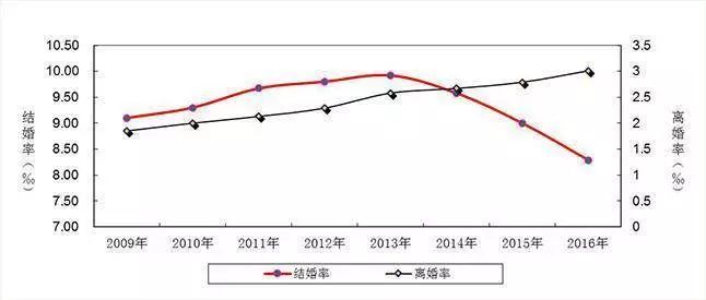 从2014年开始,中国的结婚率一路走低,2016年结婚率更是跌回到2008年的水平。与之相对的,则是离婚率不断走高,可谓中华儿女多奇志,不爱结婚爱离婚。