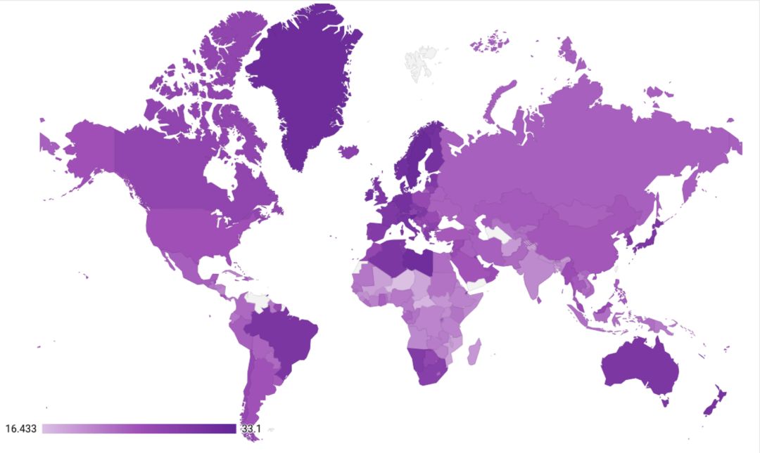 全世界女性平均初婚年龄。在剔除男性数据之后,全球结婚年龄普遍前移。中国为24.2岁 / world bank
