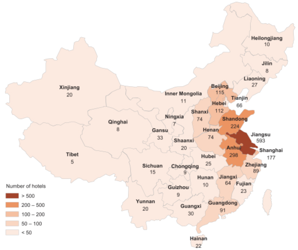 官网显示,秉持“天天低价”原则格林豪泰在2004年进入中国,有自己的销售官网和APP。截至2017年12月31日,格林豪泰酒店网络包括2,289家酒店,共190,807间客房,覆盖中国所有27个省和自治区的所有四个中央管理的城市和263个城市,以及另外306家酒店已签约或开发,预计将于2018年6月开始运营。从规模上看,格林豪泰算是国内第四大连锁酒店公司。