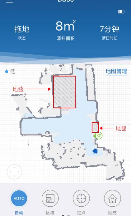 回到扫地体验上,DG36 的拖地功能也算挺智能的。水箱的渗水能力是可以调控的,可以自动调控也可以通过 app 手动调控,同时机器还能有区域分辨的能力的,当你在拖地的时候,机器人自动识别到地毯边缘的时候,就会停止拖地,避免打湿地毯。在单独的清洁模式的时候,DG36 也会识别到地毯这种区域,并且进行特殊标注,当清理到地毯的时候会加大吸力,避免清理不干净。
