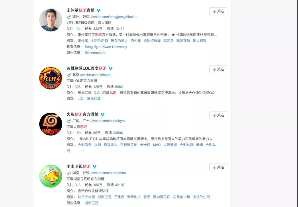 在微博上,很多明星有影响力的粉丝聚合站来自官方贴吧的注册号。某种意义上说,微博的明星贴吧号也能在一定程度上为贴吧导流。如鹿晗吧_LuhanBar、蔡徐坤贴吧官博、李宇春吧微博。