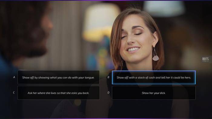 这些选项就像历史考试中“吴三桂叛变是为了陈方方、陈圆圆还是陈三角”一样,纯属废话。但它们确实是这个游戏里的欢乐之源。当选项里突然蹦出来一个“Show her your d**k”的时候,你会忍住不点击看一看吗?必须要说,男主角不愧是一天到晚上电视的网红,演技在线,各种变态男的角色驾驭得十分娴熟,给这些狗血的错误选项拍摄专门的视频并且一本正经讲解它们为什么是错的。这一招非常媚俗,但确实让《魅惑达人》更像是一款游戏了。
