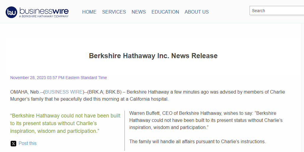巴菲特在新闻稿中写道,“如果没有查理的灵感、智慧和参与,伯克希尔-哈撒韦公司不可能发展到今天的地位。”