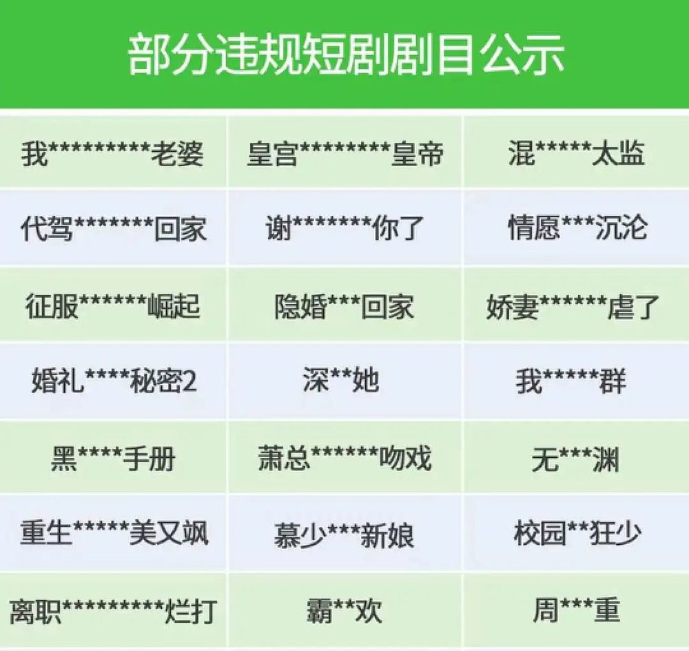 通过近期被下架的短剧名字《娇妻XXXXXX虐了》《萧总XXXXXX吻戏》等,大家也可以自行脑补一下。