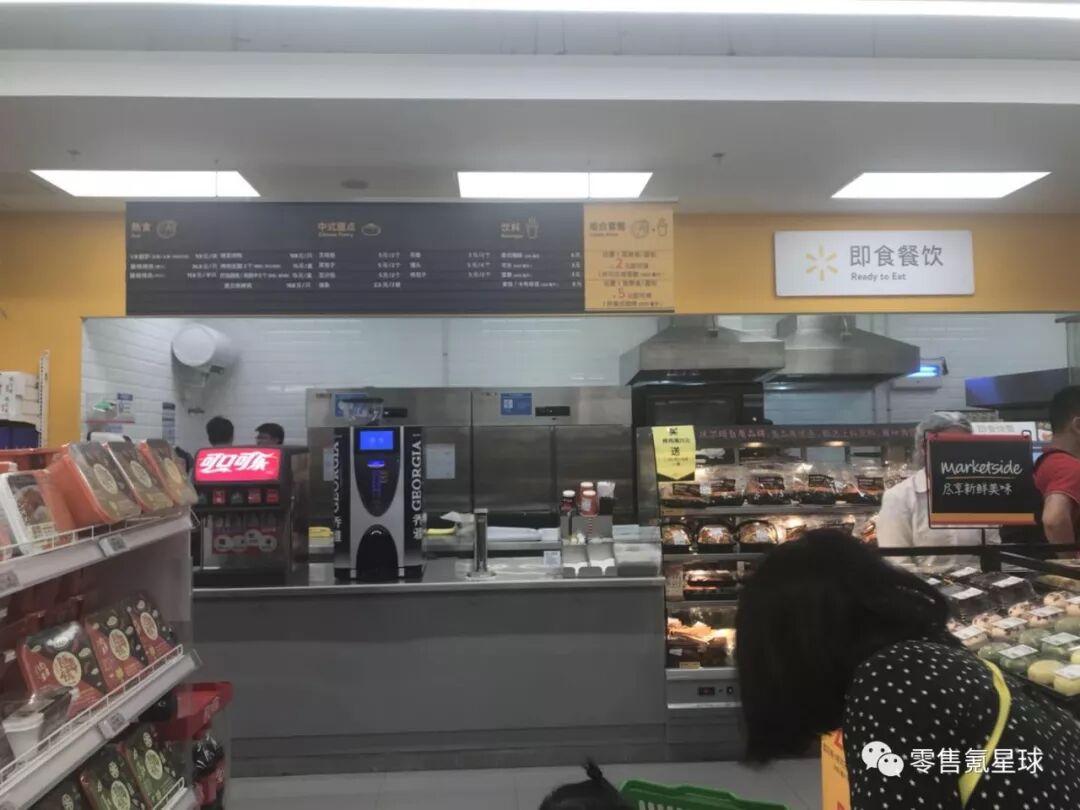 比如,在沃尔玛中国首家惠选智能超市,特意设置了一个即时餐饮区,提供现制咖啡、饮料、现切水果、即食快餐和面包熟食等,以非常低廉的价格提供三餐选择。