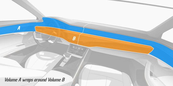 三条主线条勾勒出了 A8 驾驶位的主要轮廓,如图所示,奥迪希望让交互界面所在的体积(B)悬浮在前排成员触手可及的地方,其他的体量(A)(木饰、皮革等等)自然后退,给乘客留出最大的乘坐空间,并在语义上呈现出A环绕B的感观。