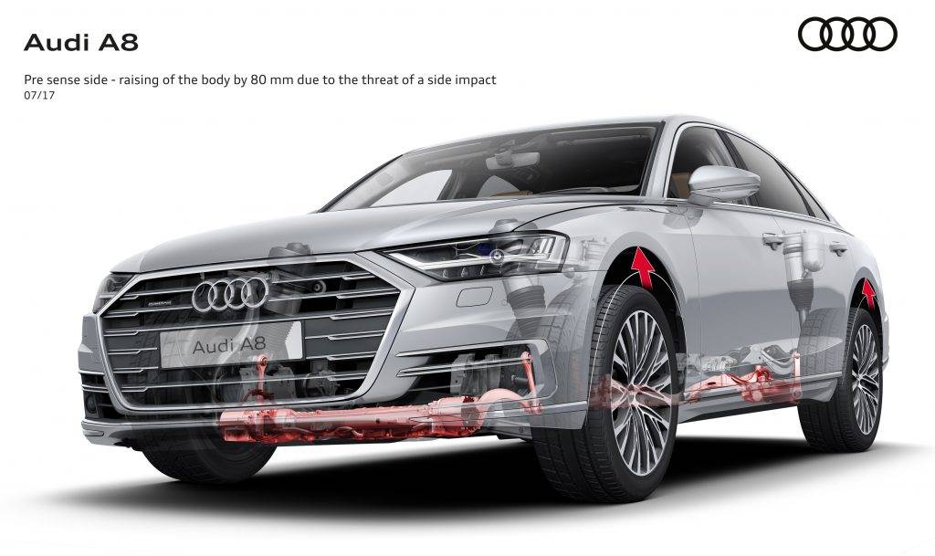 A8 还有个亮点功能,就是车辆的主动悬架会在碰撞了来临的那一刻瞬间抬高,用更结实的底梁挡住冲击。