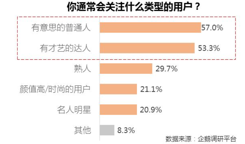 2. 快手和抖音用户更喜欢关注有意思的普通人和才艺达人,在没有大规模引入流量明星的背景下,快手和抖音都实现了用户消费粘性的构建,这种相对去中心化的社区对于短视频创作者是利好;