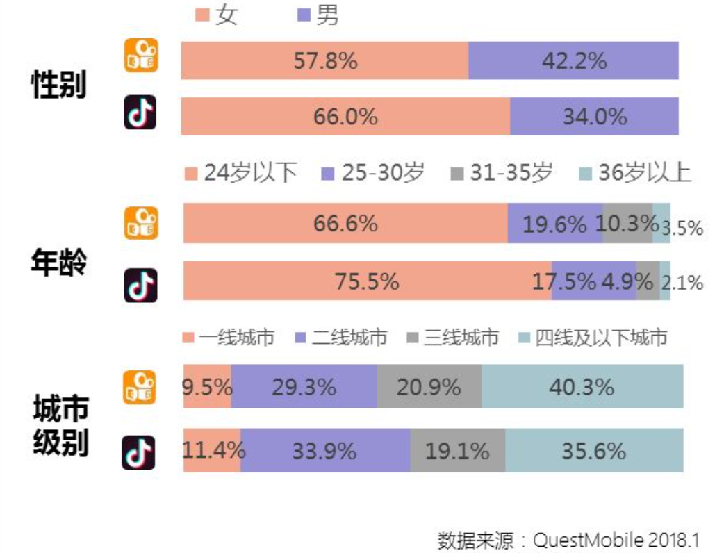 5. 抖音在女性用户,年轻用户,高收入高学历用户,和一二线城市用户占比上高于快手,但并未形成明显的用户画像对立。两者的主要用户粮仓依然在非一线城市。