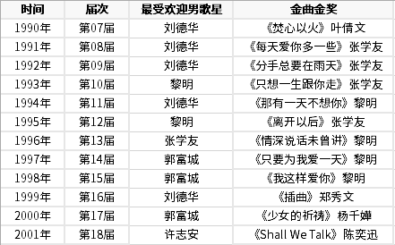 如果从1990年算起,这四人对劲歌金曲颁奖典礼最受欢迎男歌手这一奖项的垄断长达11年,年度金曲也几乎被张学友和黎明瓜分。