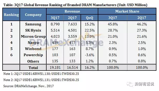 2017年第三季度,韩国的三星和海力士占据全球内存(DRAM)市场的74.5%,两家公司在DRAM上单季营收143亿美元。此外,美国美光占21%,三家公司瓜分殆尽。