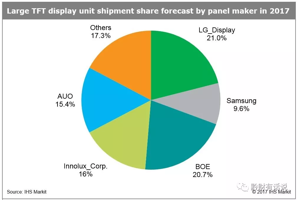 2017年第三季度,京东方在9寸以上大尺寸LCD面板获得了21.7%的市场份额,超越LG的19.3%,首次成为全球第一。