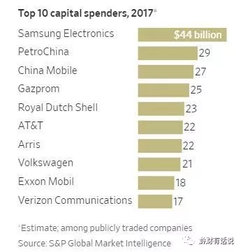 举个例子,三星电子去年资本开支440亿美元,位居全球上市公司之最,远超全球第二名。排前10的其他公司:4家石油公司、4家通讯/电视运营商。除三星电子外,只有一家是制造业——大众汽车,其资本开支不到三星的一半。
