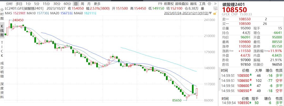 12月13日,距离收盘仅剩10分钟左右的时间,碳酸锂期货全线尾盘大幅拉升,02合约至11合约全部收于涨停,主力合约07以上涨9.98%,报收103550元/吨。