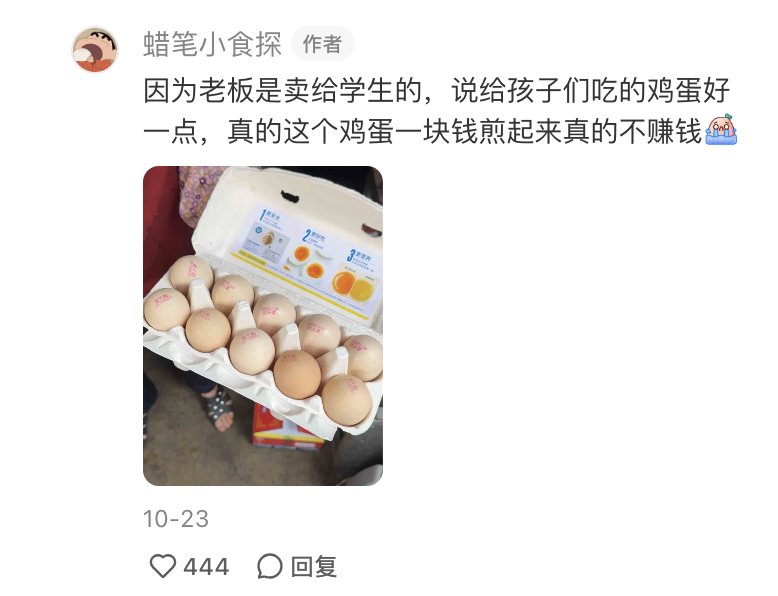 随后,博主补上了老奶奶小摊用的鸡蛋,是超市里比较好的那种。并配文:“一块钱一个真的不赚钱。”
