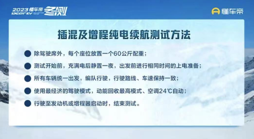 当然,懂车帝在今天(14日)举行了2023冬测开放日再次进行测试。不过就测试方法而言,其实还是有很多漏洞存在。比如说,下面这个条件提到只要发动机介入,就算测试终止。这个办法显然是学习了国标测试方法,但国标方法是常温测试。