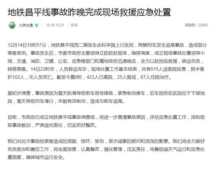 据北京交通官微消息,12月14日18时57分,地铁昌平线西二旗至生命科学园上行区间,两辆列车发生追尾事故,造成部分乘客受伤。事故发生后,北京市委市政府主要领导立即赶赴现场,指挥调度,成立现场事故处置领导小组,交通、消防、卫健、公安、应急等部门和属地政府迅速响应,全力以赴抢险救援,转运伤员,转移乘客。14日23时许,人员转运完毕,现场处置工作基本结束,共有515人送医院检查,其中骨折102人,无人员死亡。截至今晨6时,423人已离院,25人留观,67人住院治疗。