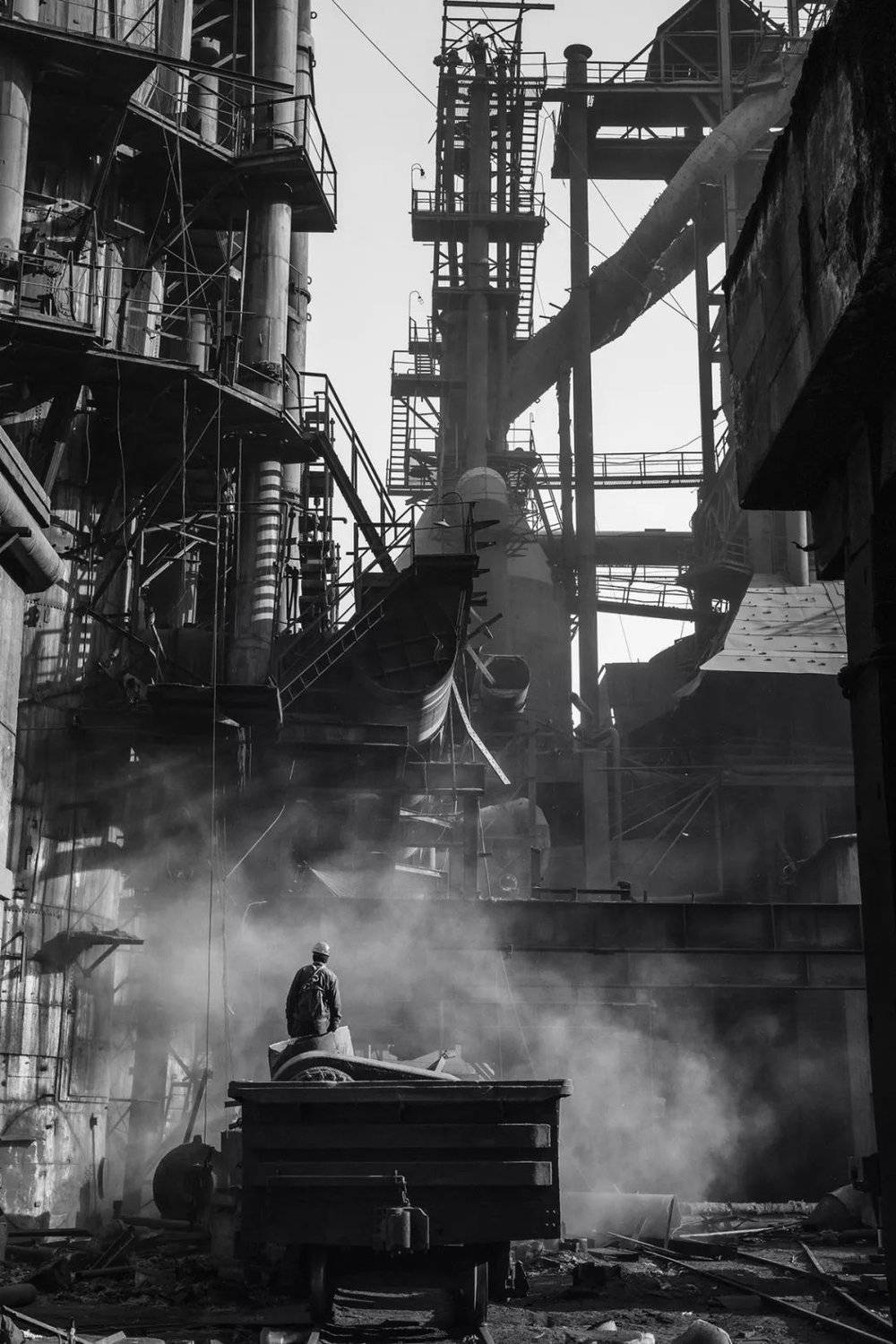 工业摄影中要有人的想法,基于我对工人的情感。 20 世纪 80 年代末,有一次我到辽河油田拍照,回来路过沟帮子车站,那是京沈线上的一个小站。我在那儿等火车,旁边坐了一个老工人。